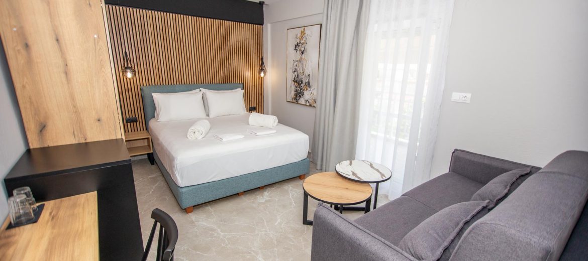 Το δωμάτιο διαθέτει 1 διπλό κρεβάτι, δύο καναπέδες κρεβάτια και μπαλκόνι με θέα στη θάλασσα, ιδανικό για στιγμές χαλάρωσης. Περιλαμβάνει όλες τις απαραίτητες παροχές για μία ευχάριστη και ξεκούραστη διαμονή, μόλις 300 μέτρα από τη θάλασσα.